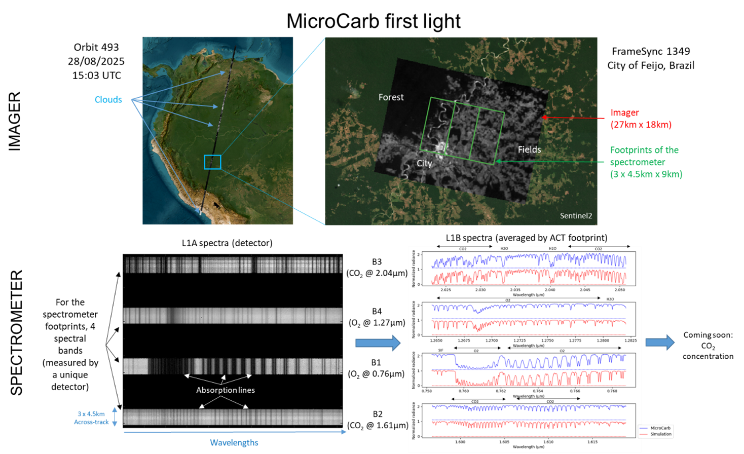 The imager made it possible to identify cloud-free areas in the equatorial forest. A city surrounded by forest and agricultural areas can be seen. The spectrometer disperses the reflected light in four spectral bands. Absorption lines due to carbon dioxide and oxygen can be distinguished, which will allow us to estimate the CO2 concentration.